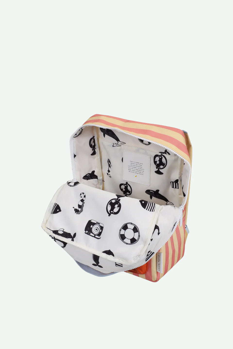 It has an extra pocket on the front, waterproof lining with a handdrawn pattern and adjustable shoulder straps. On the inside you'll find an elastic band that serves as a bottle holder and a pocket all over the back that closes with velcro. There is also a name tag to put your info.