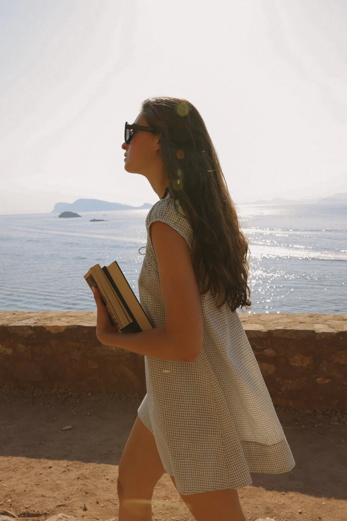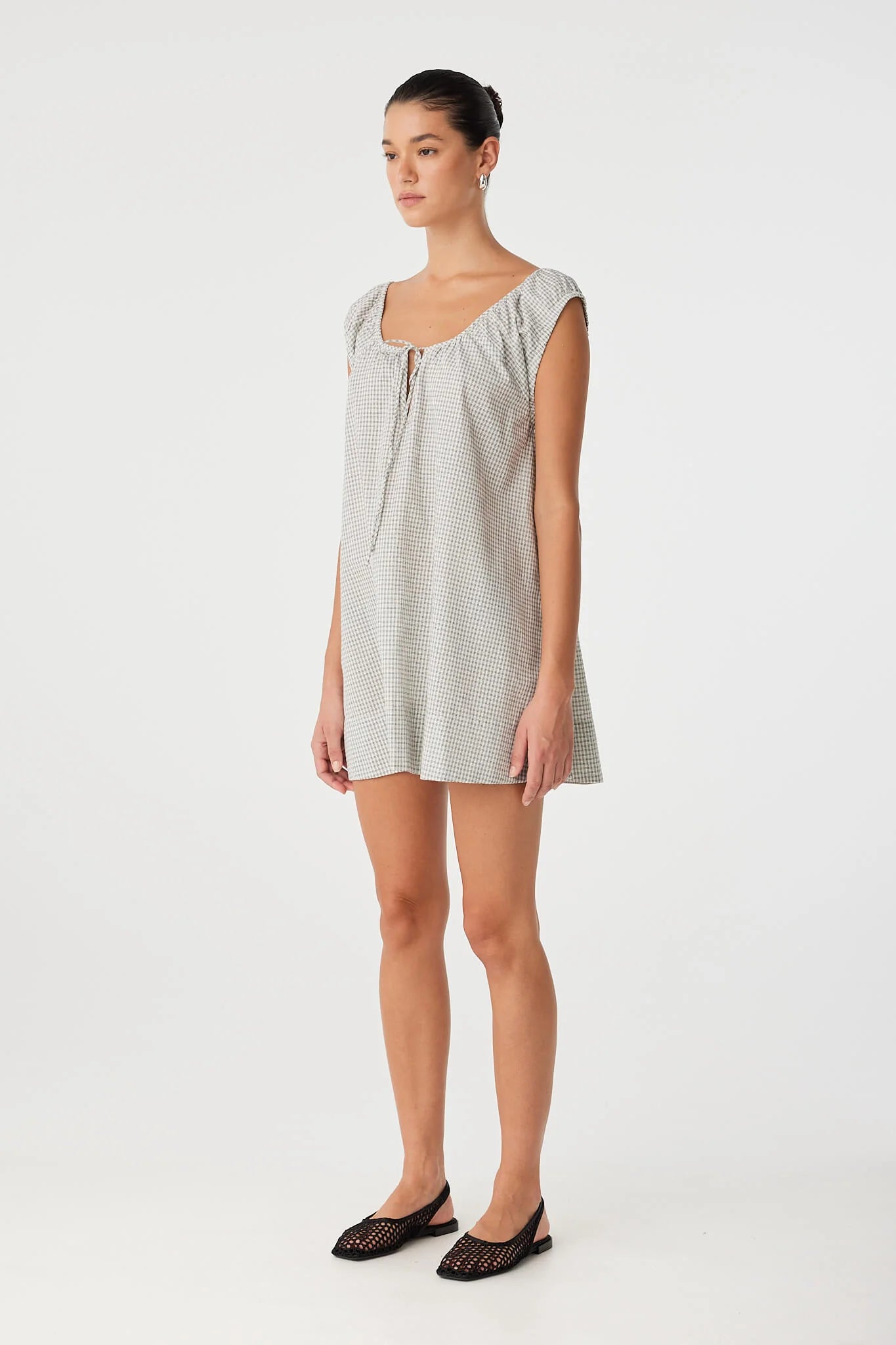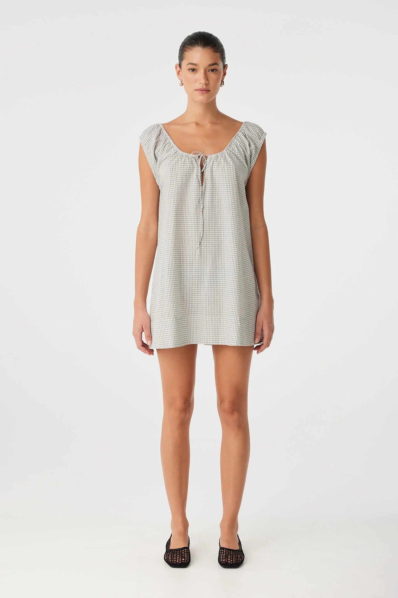 A softly flared mini dress in breezy cotton check, designed with an adjustable drawstring neckline and delicate keyhole detail at the front. Relaxed and easy through warm days or layered in between seasons.