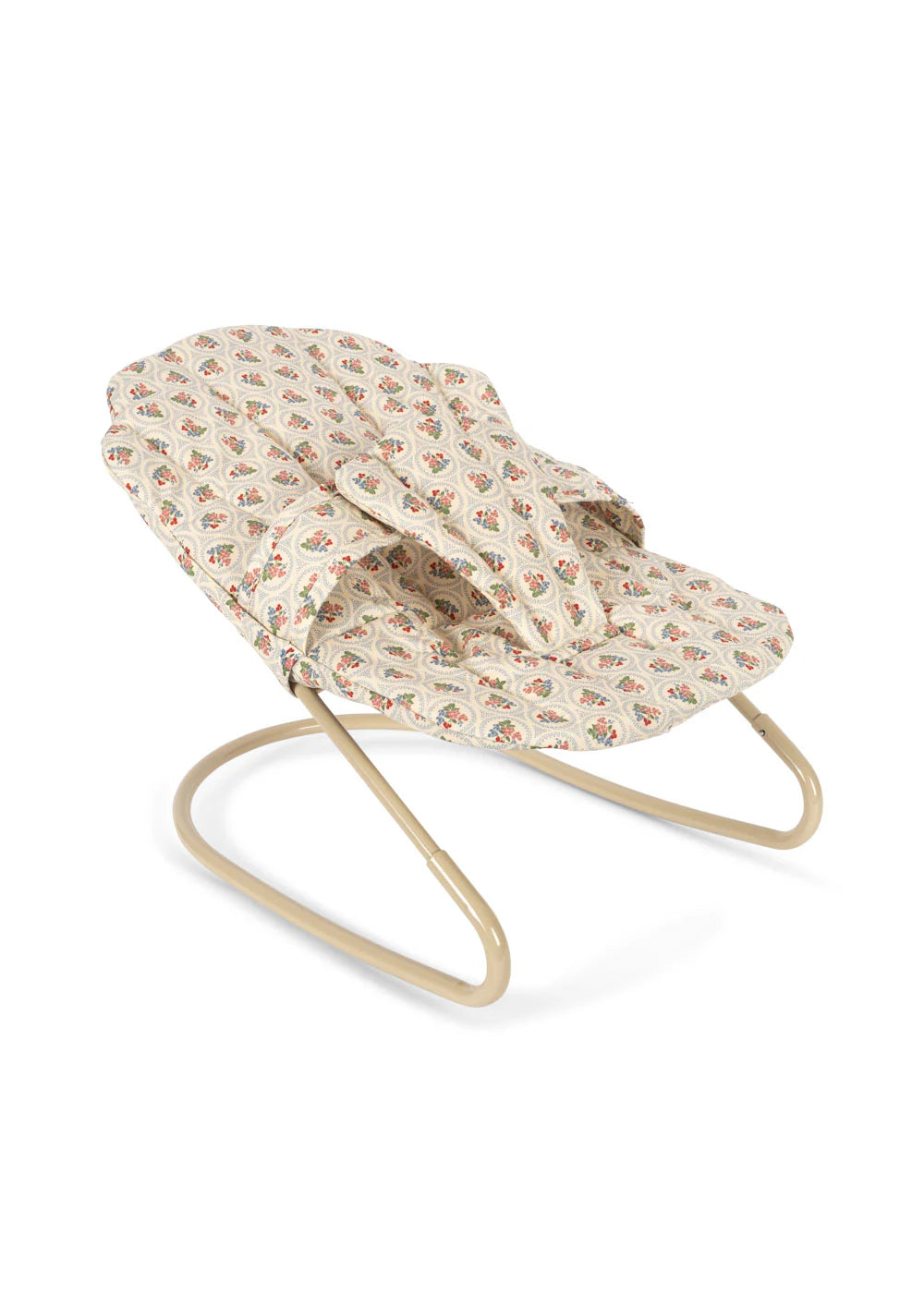 Bouncer made for dolls. The fabric cushion seat is made from cotton with polyester padding inside. The seat is easy to remove and machine wash. The frame is made from metal.