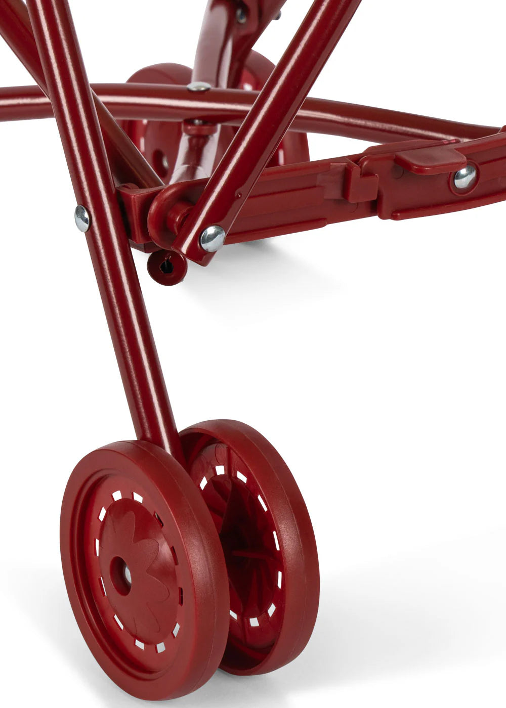 Doll stroller designed with a harness, carriage bag, and double wheels on all four legs for extra stability. Features removable fabric. Comes fully assembled and is easy to fold and store.