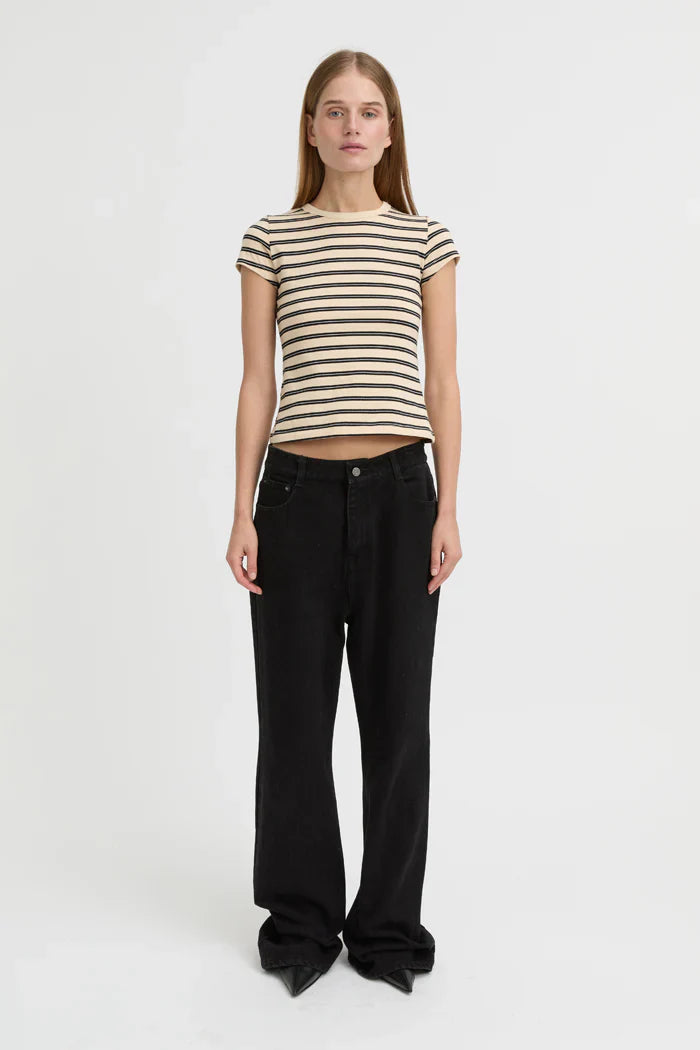 The Kendra Tee in Beige is a refined take on the classic baby tee, offering a sleek, form-fitting silhouette with elevated everyday appeal. Crafted in a soft beige cotton blend with contrast black stripes, it hugs the body with just the right amount of stretch. A minimalist crew neckline and short sleeves keep the shape clean and versatile, while tonal embroidery at the chest delivers a subtle branded finish. Designed to pair effortlessly with denim, tailored trousers or layered under oversized outerwear.
