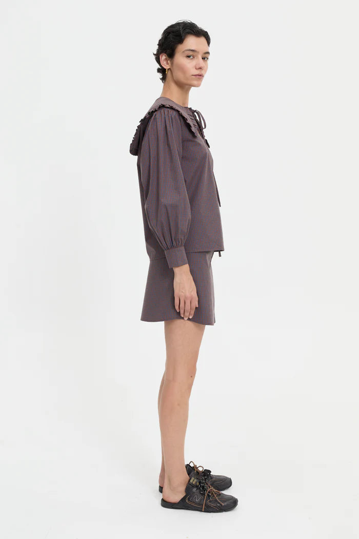 Cut from lightweight cotton in a micro brown and blue check, it features an oversized ruffled collar with adjustable tie detailing, button-down front, and gathered cuffs.