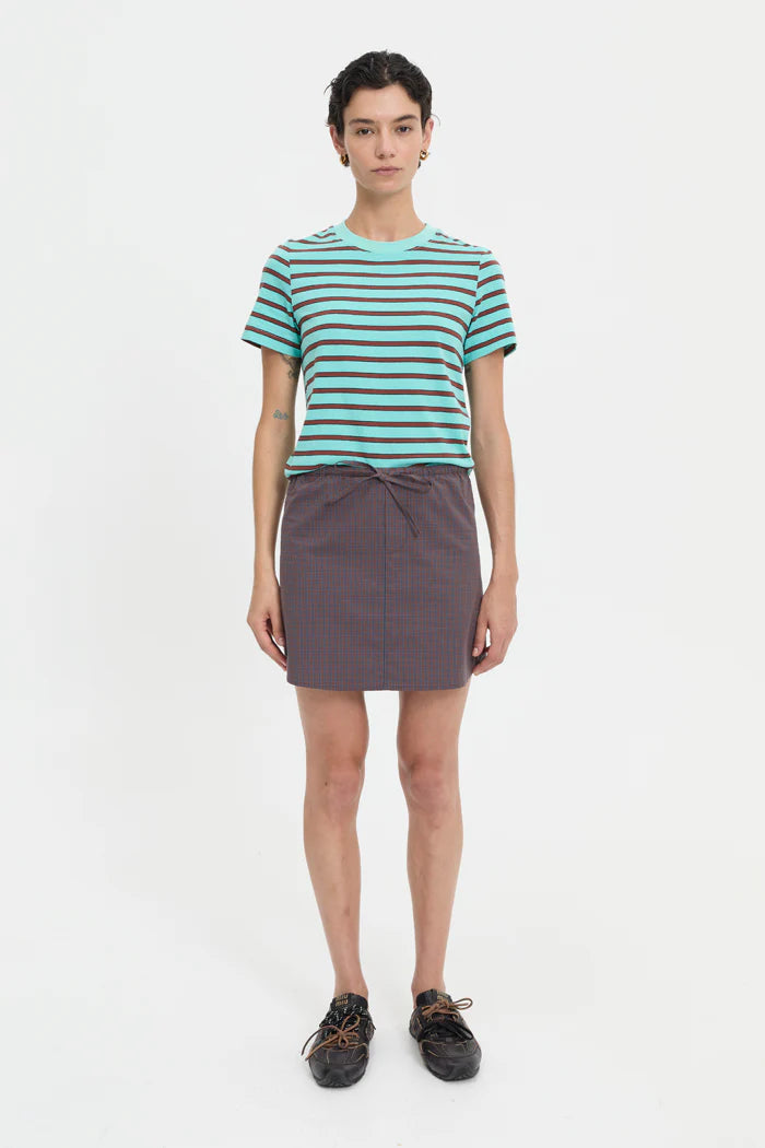 Cut from lightweight cotton in a micro brown and blue check, it features a drawstring waistband and straight hem for ease of movement.