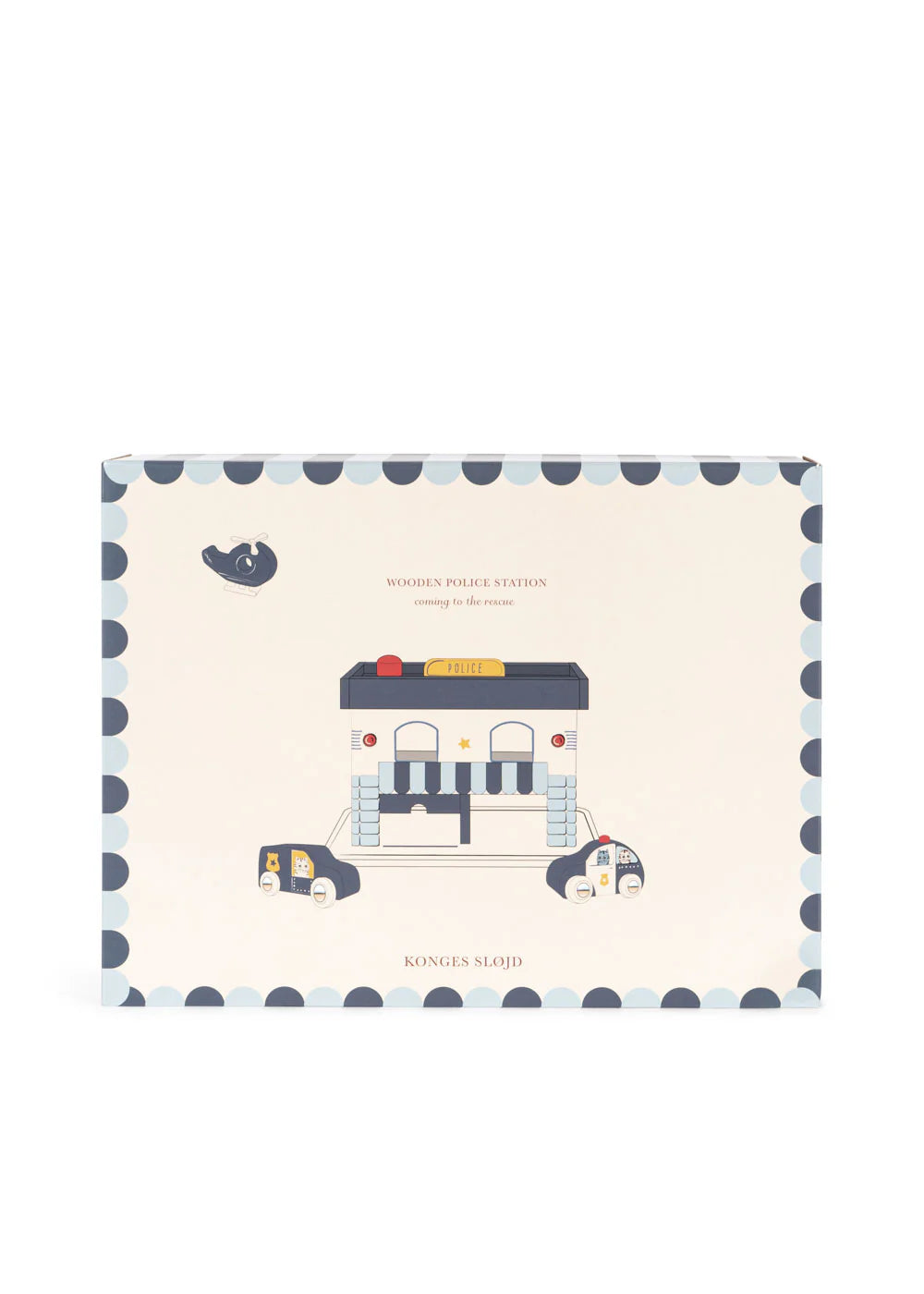 Wooden police station that includes two cars and one helicopter.